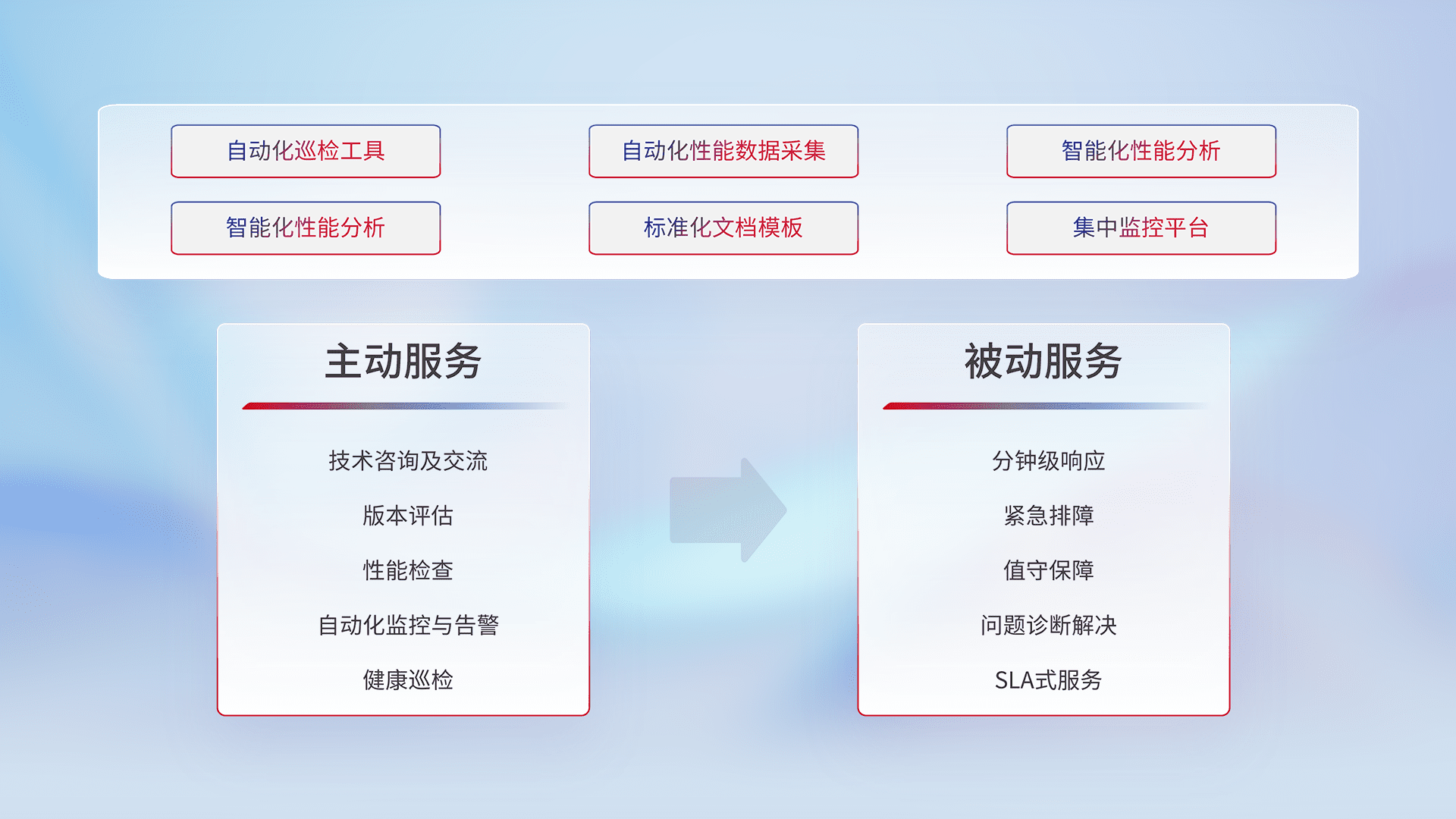 智能化工具和标准化文档,,,保障服务质量,,,提供主动服务(包含技术咨询、、、版本评估、、、、性能检查、、自动化监控与告警、、、、健康巡检)和被动服务包含(分钟级响应、、紧急排障、、、值守保障、、、问题诊断解决、、、SLA服务)。。。